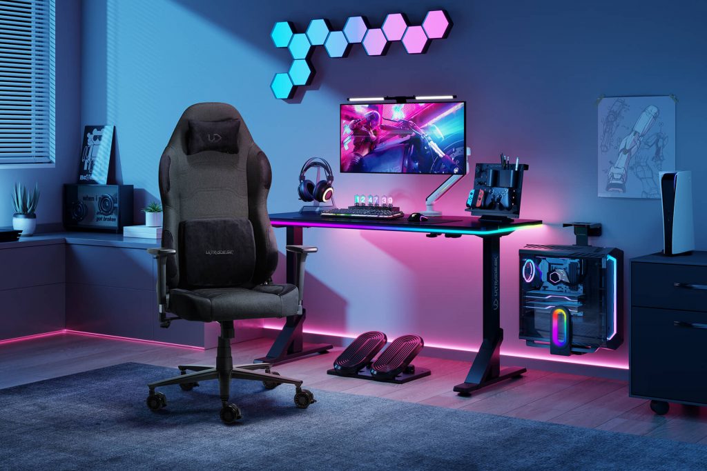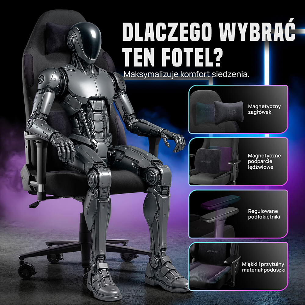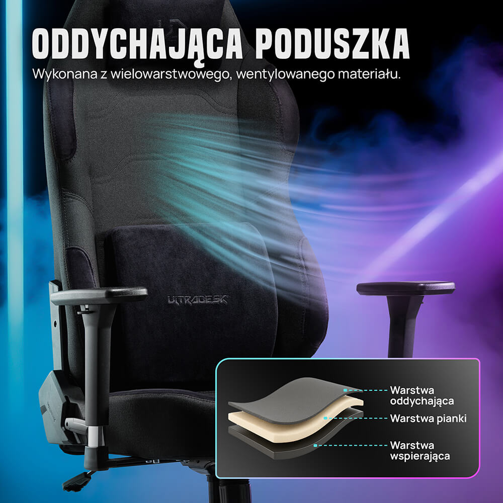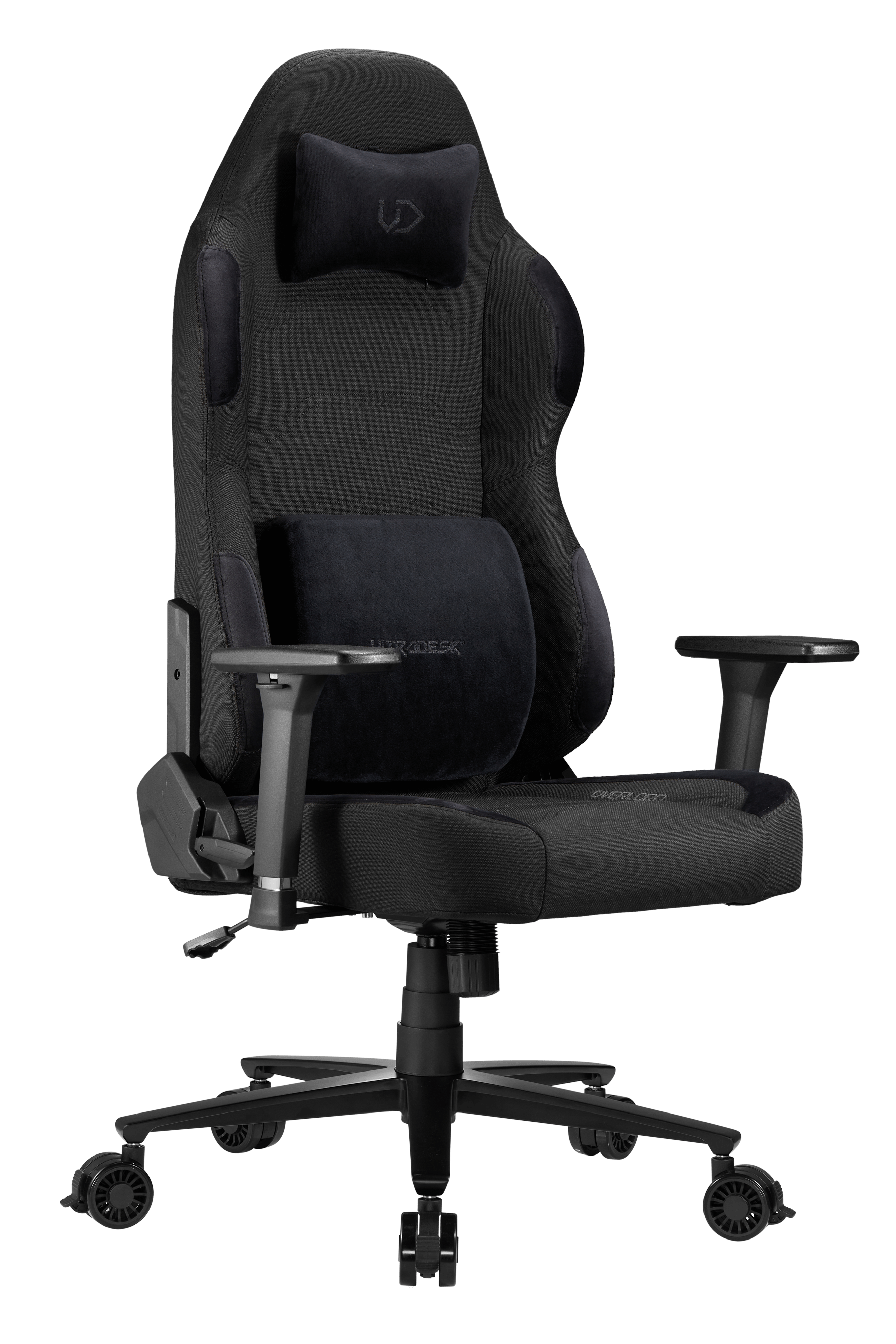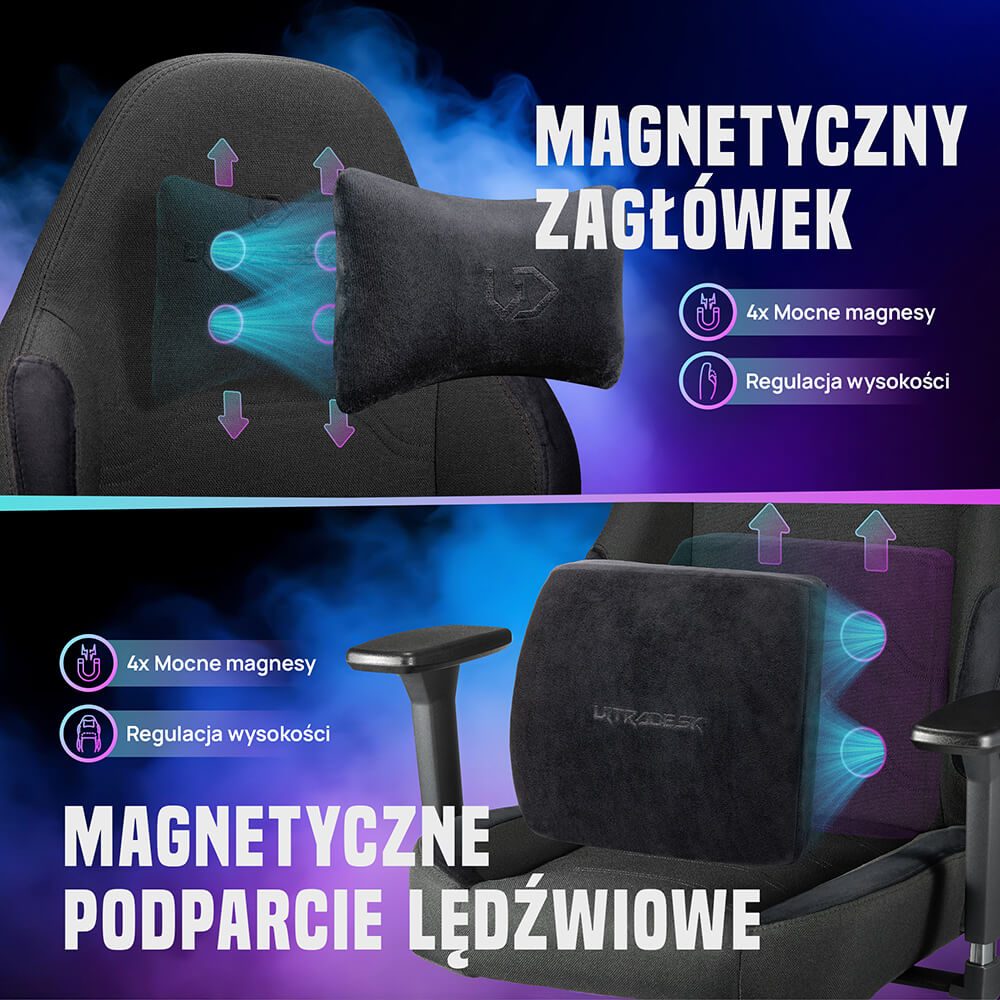 Mebel wyposażono w ergonomiczny zagłówek oraz specjalne podparcie lędźwiowe. Oba elementy mocowane są za pomocą mocnych magnesów – metoda ta gwarantuje szybką i stabilną instalację na oparciu fotela. Ponadto oferują regulację wysokości, co umożliwia idealne dopasowanie ich położenia do wzrostu i sylwetki użytkownika. Zastosowanie zagłówka pomaga w utrzymaniu prawidłowej postawy, redukcji napięcia mięśni karku oraz zapobieganiu bólom. Całość utrzymana jest w klasycznej czerni, co gwarantuje uniwersalność i łatwe wkomponowanie się w estetykę fotela ULTRADESK OVERLORD.