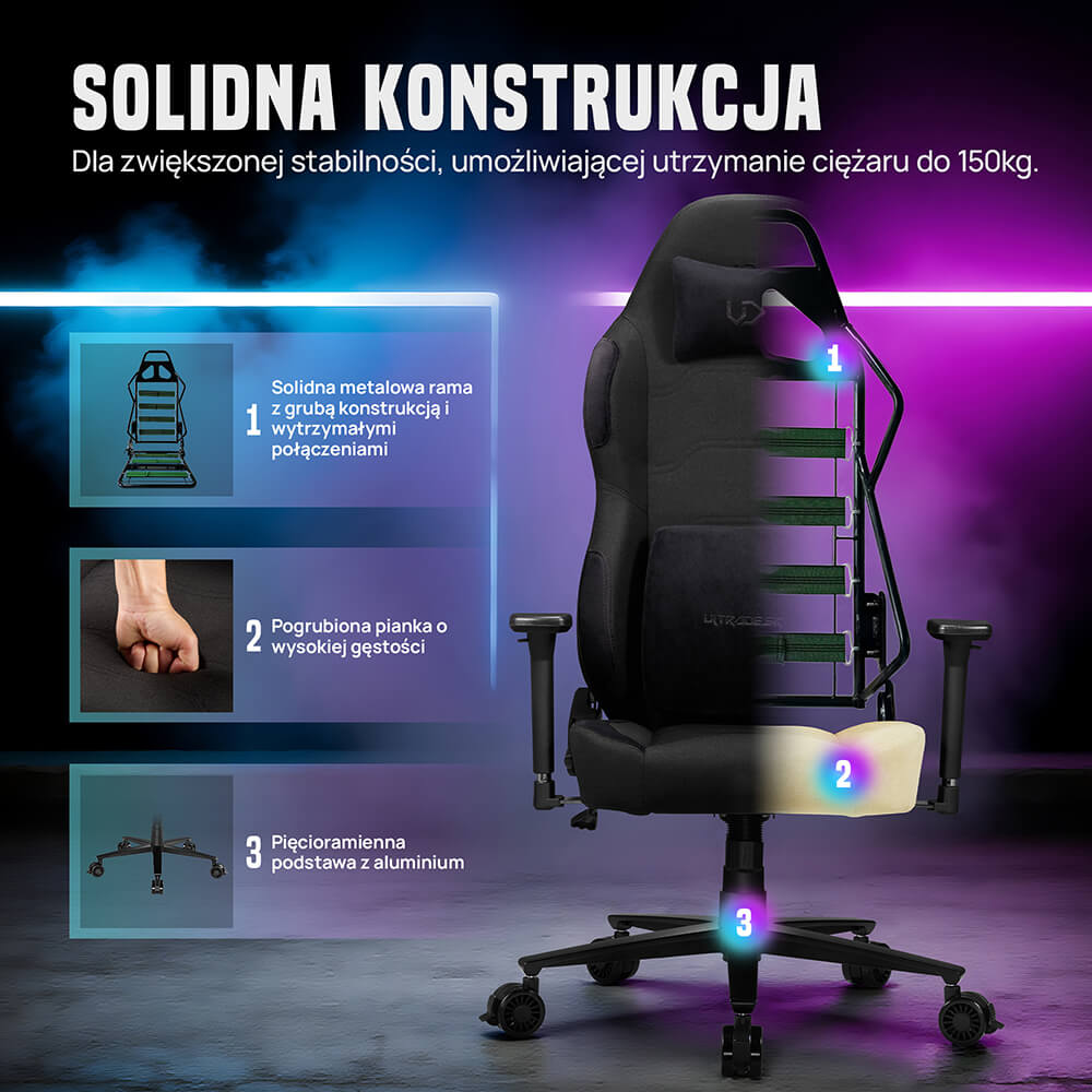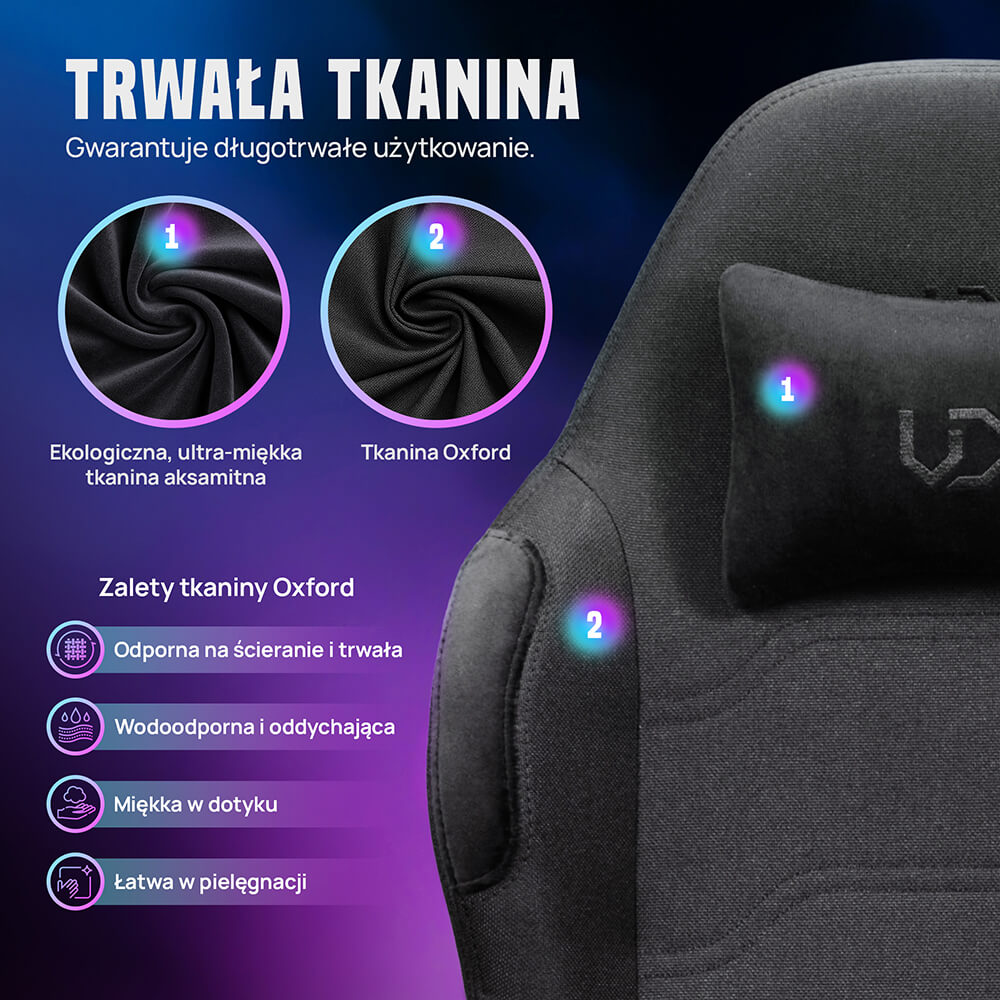 ULTRADESK OVERLORD to nowoczesny fotel komputerowy, który świetnie łączy ze sobą walory techniczne, funkcjonalne oraz wysoką jakość materiałów. Oferuje regulację wysokości, odchylane oparcie, podłokietniki 3D oraz zestaw magnetycznych poduszek. Pogrubione, szerokie siedzisko z precyzyjnym wyprofilowaniem zapewnia dodatkową przestrzeń do zmiany pozycji, jednocześnie redukując obciążenie kluczowych części ciała. Solidna rama ze stali oraz aluminiowa podstawa odpowiadają za stabilność, a wielowarstwowe wnętrze uwydatnia ergonomiczne walory fotela. Zastosowana tapicerka z tkaniny Oxford na bardzo długo zachowa perfekcyjny wygląd i będzie zachwycała wygodą.