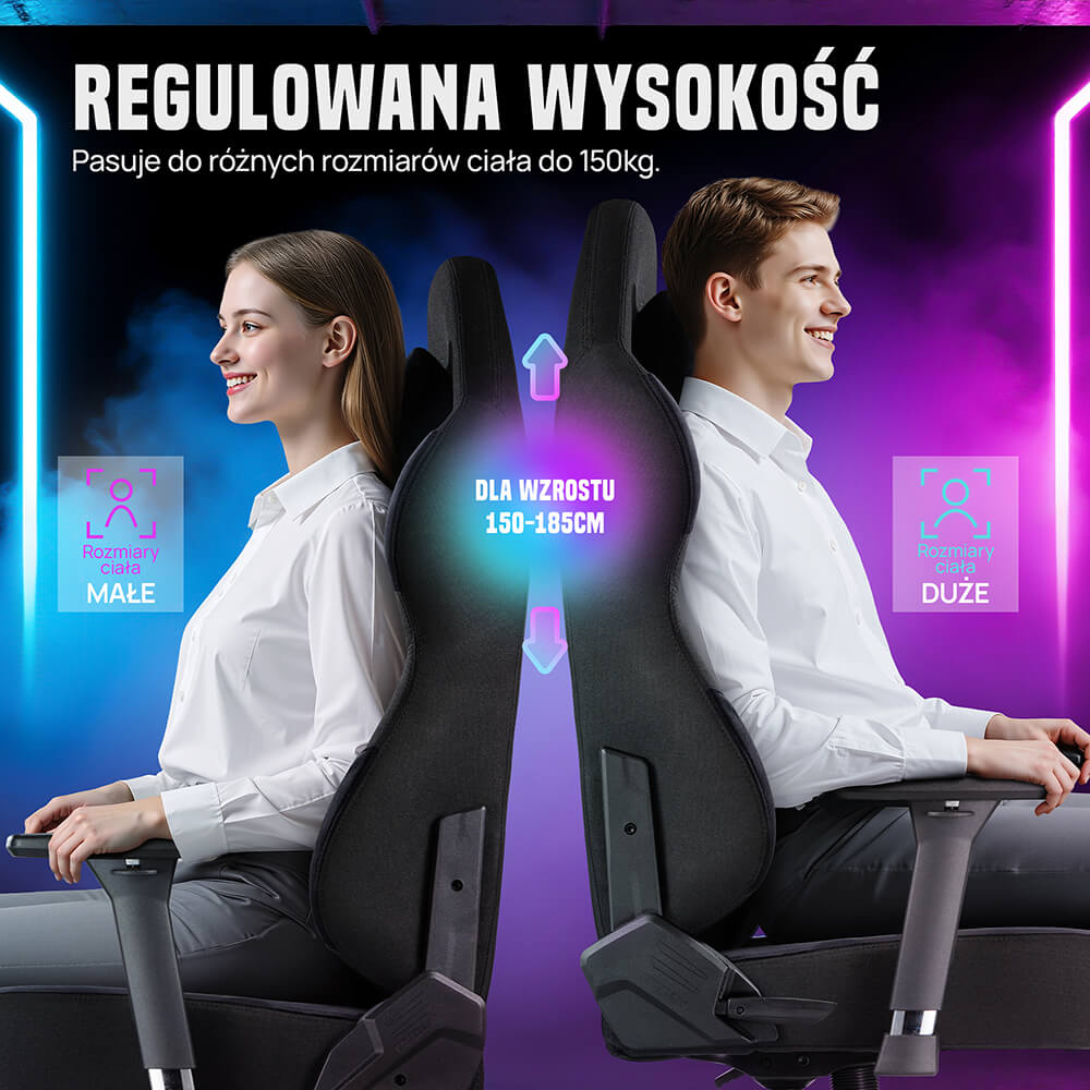 Produkt został zaprojektowany dla osób o wzroście od 150 do 185 cm, a maksymalna dopuszczalna waga ciała wynosi aż 150 kg. Dopasowanie wysokości fotela obrotowego do rozmiaru ciała jest kluczowe dla ergonomii i zdrowia kręgosłupa, ponieważ umożliwia utrzymanie neutralnej i prawidłowej postawy, znacząco minimalizując ryzyko bólu i problemów zdrowotnych. Właściwa wysokość pozwala na równomierne rozłożenie ciężaru ciała i utrzymanie naturalnej krzywizny kręgosłupa. Zapobiega to napięciom mięśniowym w odcinku lędźwiowym, piersiowym i szyjnym, które są wynikiem kompensowania złej postawy.