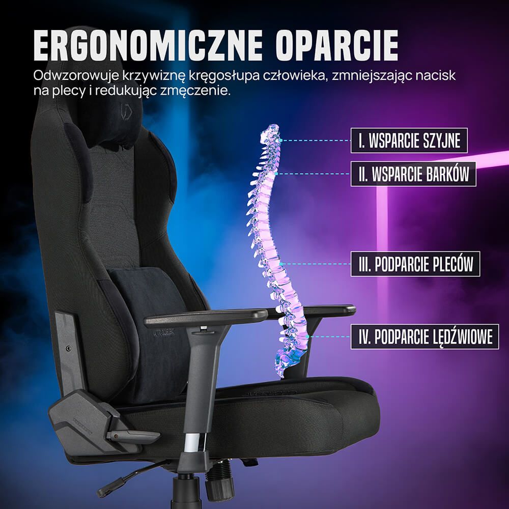 Oparcie zostało zaprojektowane tak, aby odwzorowywać naturalną krzywiznę kręgosłupa człowieka. Jego głównym celem jest zmniejszenie nacisku na plecy i zredukowanie ogólnego zmęczenia podczas długotrwałego siedzenia. Wsparcie szyjne zwiększa komfort oraz ułatwia odciążenie karku. Wsparcie barków stabilizuje górną część tułowia. Ergonomiczne podparcie pleców ma pozytywny wpływ na komfort na całym odcinku kręgosłupa piersiowego. Podparcie lędźwiowe jest kluczowe dla zachowania naturalnej krzywizny i wsparcia dolnej części pleców. Zdrowie i komfort idą w parze!