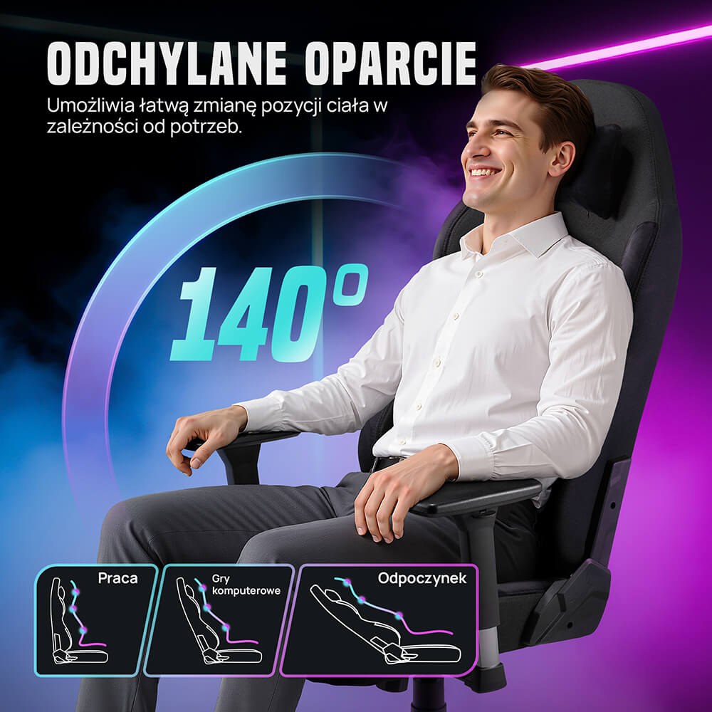 Odchylane oparcie umożliwia łatwą zmianę pozycji ciała w zależności od potrzeb. Szeroki zakres dopuszczalnego odchylenia sprawia, że fotel zyskuje uniwersalny charakter i sprawdzi się wzorowo w różnorodnych sytuacjach. Bez względu na to czy planujecie pracę, rozrywkę z grami komputerowymi lub chwilę odpoczynku, oparcie umożliwi Wam dobranie idealnego ustawienia. Oparcie fotela ULTRADESK OVERLORD można odchylać w zakresie do 140 stopni. Do obsługi tego ustawienia służy wygodna dźwignia umieszczona po prawej stronie.