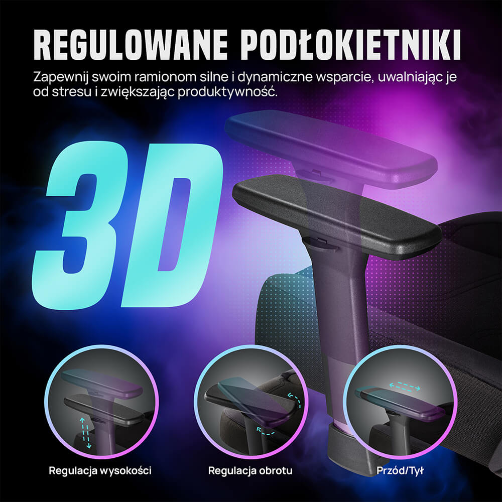 Podłokietniki typu 3D oferują trzy płaszczyzny regulacji, a ich podstawowym zadaniem jest zwiększanie produktywności użytkownika poprzez utrzymanie ergonomicznej pozycji ciała. Regulacja 3D pozwala na precyzyjne dopasowanie położenia podłokietników do postury użytkownika oraz wysokości biurka, co jest kluczowe dla odciążenia barków i szyi. Użytkownik może regulować wysokość poprzez przesuwanie w górę lub w dół w płaszczyźnie pionowej. Z kolei regulacja obrotu pozwala na przemieszczanie nakładki podłokietnika w płaszczyźnie poziomej. Trzeci mechanizm regulacji zapewnia możliwość przesuwania nakładki do przodu lub do tyłu, aby dopasować wsparcie do długości przedramienia i odległości od krawędzi biurka. Dzięki możliwości ruchu w tych trzech płaszczyznach (góra/dół, obrót, przód/tył), podłokietniki 3D znacząco poprawiają ergonomię i komfort długotrwałego siedzenia.