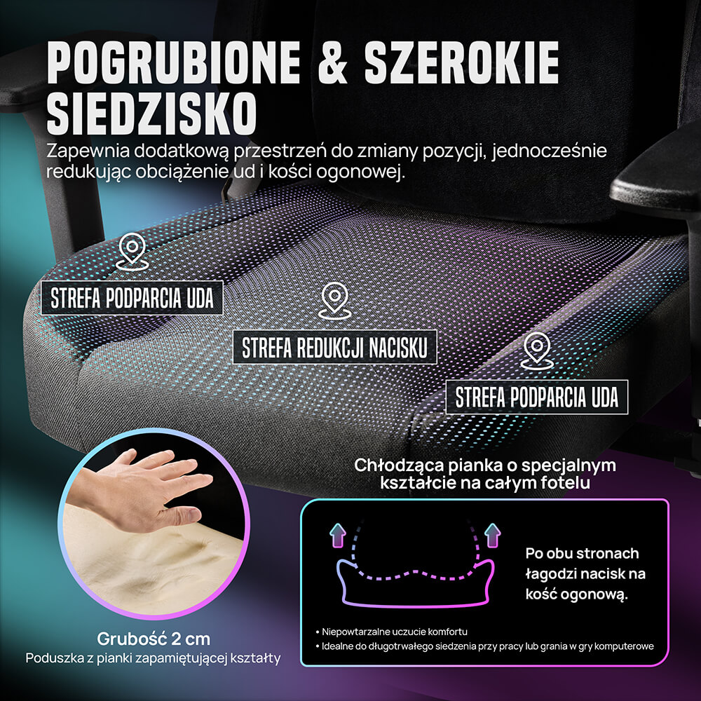 Struktura zewnętrzna siedziska została oparta o najnowsze badania dotyczące prawidłowej pozycji ciała podczas korzystania z komputera za biurkiem. Cechuje się ergonomicznymi kształtami na całej powierzchni użytkowej. Siedzisko zostało pogrubione i poszerzone, aby zmaksymalizować komfort i dać użytkownikom większą swobodę ruchów niż w ciasnych fotelach dla graczy dotychczas obecnych na rynku. Kształt siedziska efektywnie redukuje obciążenie ud i kości ogonowej. Po obu bokach dodano specjalnie wyprofilowane strefy podparcia ud. Wewnątrz siedziska umieszczono poduszkę z trwałej pianki zapamiętującej kształty.