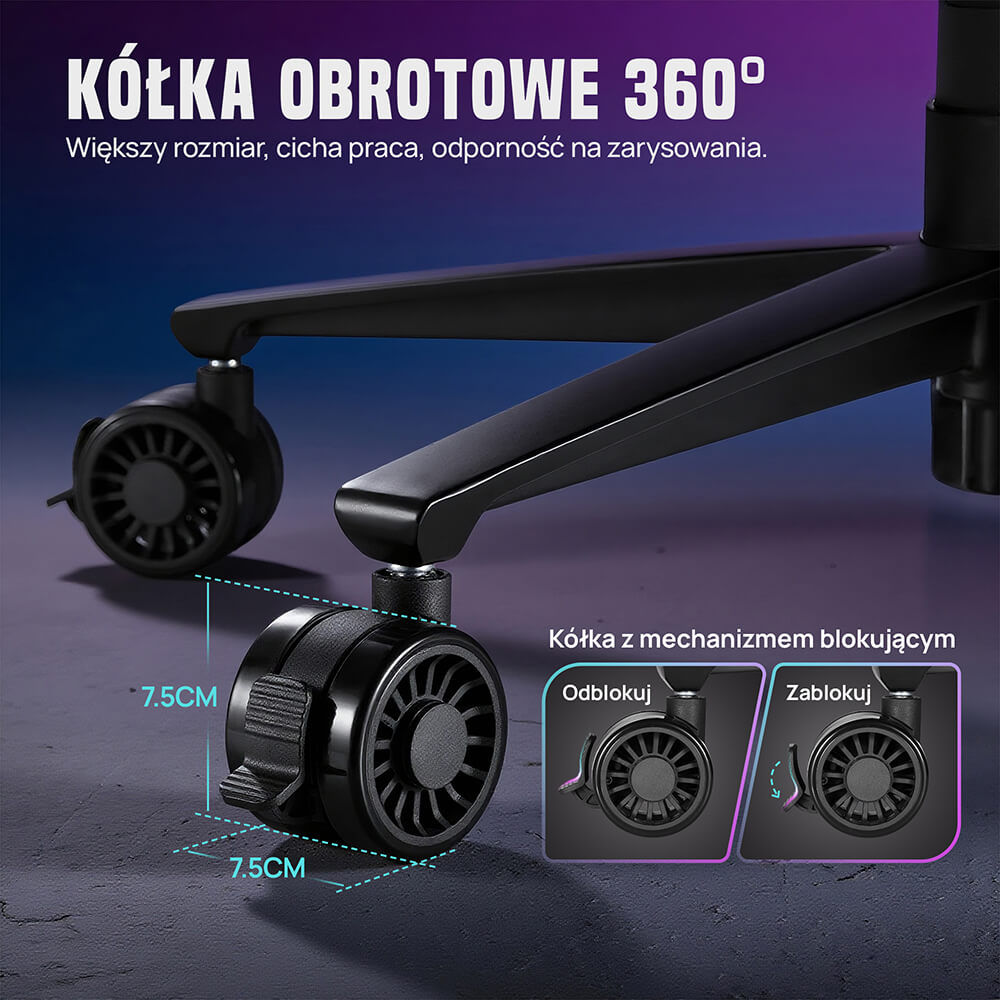 W zestawie znajdziecie funkcjonalne kółka obrotowe 360° o dużej średnicy równej 7,5 cm, które zapewniają swobodę ruchów na wielu typach powierzchni oraz bardzo cichą pracę. Zostały wykonane z materiału, który nie jest podatny na pęknięcia pod dużym naciskiem. Jeżeli chcecie zatrzymać fotel w wybranym miejscu, możecie skorzystać z funkcjonalnych blokad, które bez trudu w razie potrzeby ponownie zwolnicie. Dodatkową zaletą wybranych kółek jest fakt, iż nie rysują podłóg wykonanych z delikatnych materiałów.