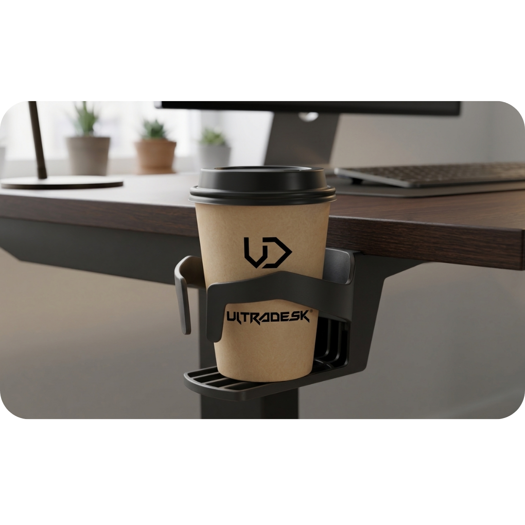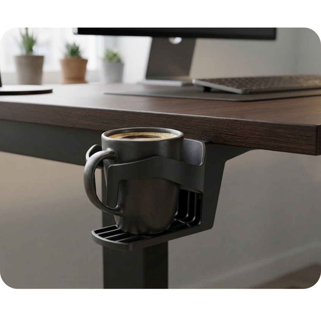 Oszczędność miejsca: Przeniesienie napoju poza obrys biurka zwalnia przestrzeń na dokumenty, myszkę i klawiaturę.