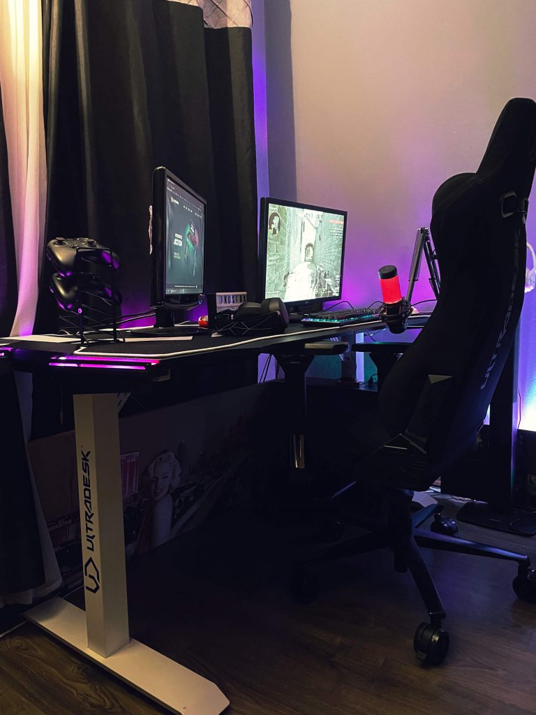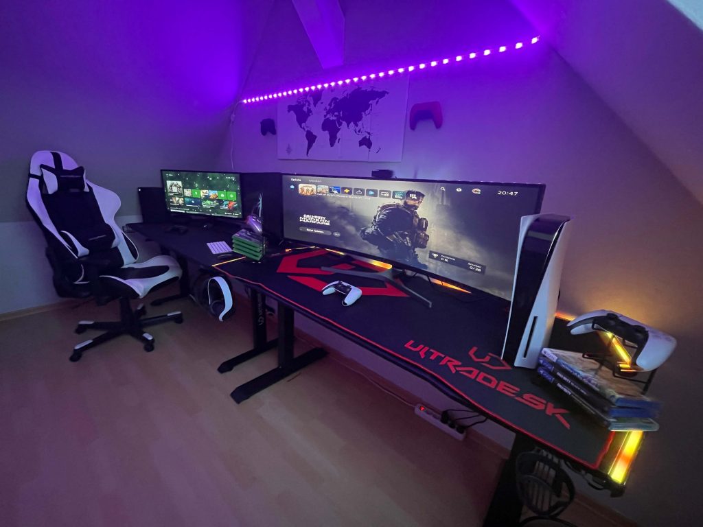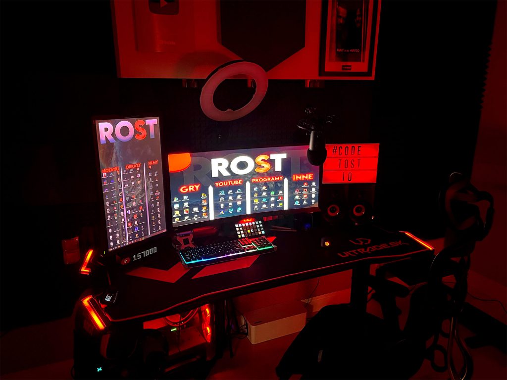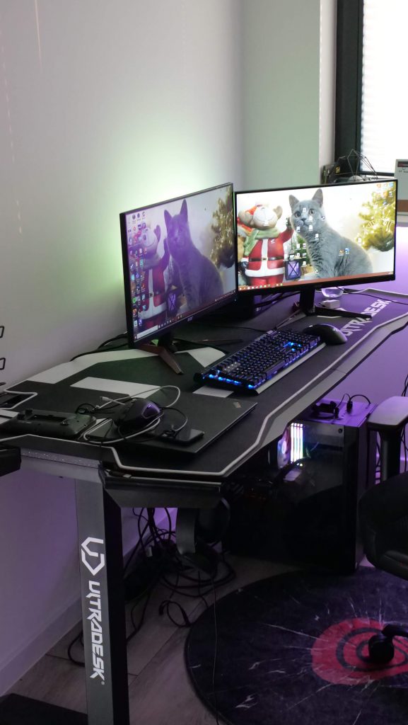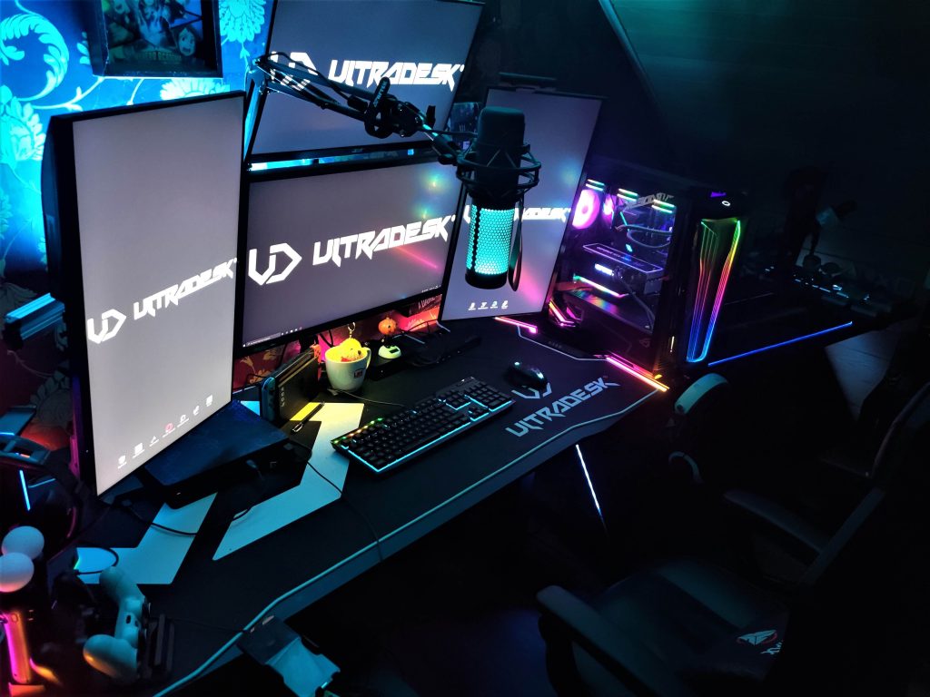 Ultradesk FORCE oferuje największą powierzchnię roboczą spośród wszystkich modeli naszej marki. Blat został pokryty specjalną karbonową powierzchnią ochronną, która zabezpiecza go przed uszkodzeniami, trwałymi przebarwieniami i wilgocią. Rama wykonana jest z grubej stali i jest uzupełniona specjalnymi elementami wzmacniającymi. Oferuje wzorowe właściwości statyczne nawet przy obciążeniu konstrukcji dużą ilością sprzętu. Przednia krawędź pulpitu została pochylona na całej długości w celu ułatwienia korzystania z klawiatury i myszy komputerowej. Z tyłu znajduje się długa komora do zarządzania kablami i zasilaniem. Podkładka pod mysz w rozmiarze XXL zawsze dołączona w zestawie.