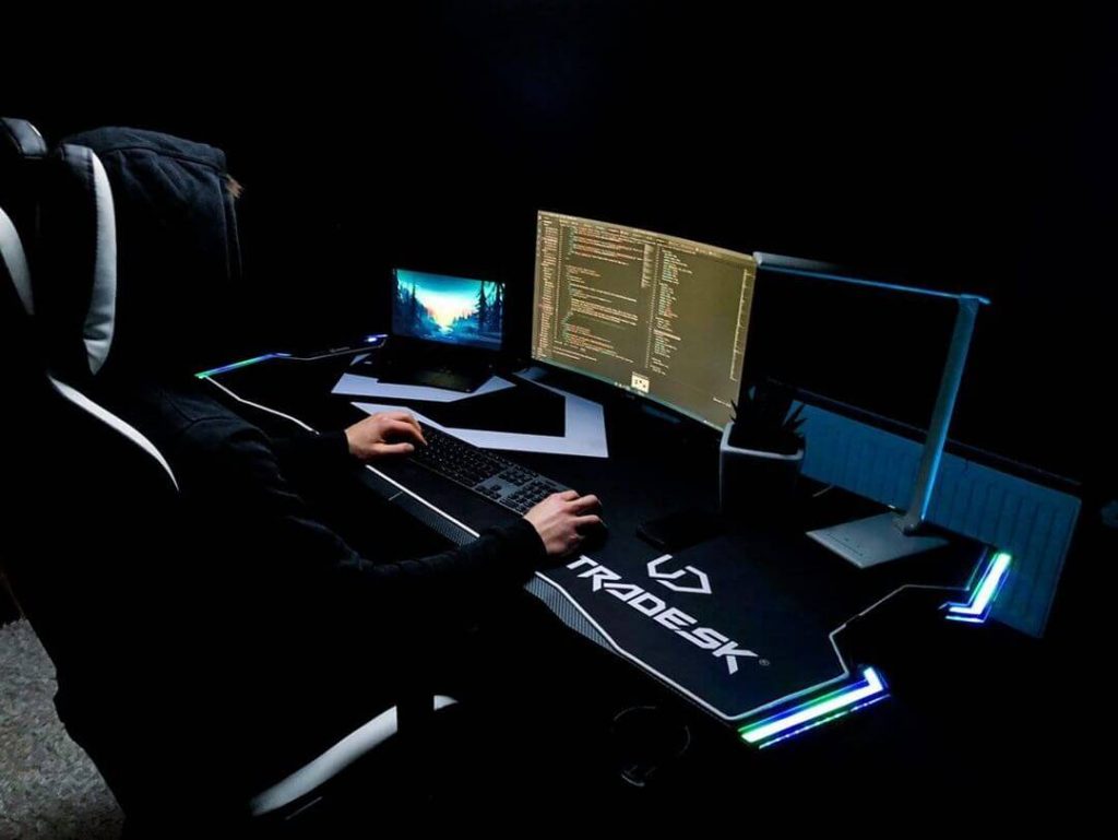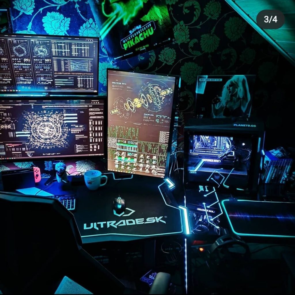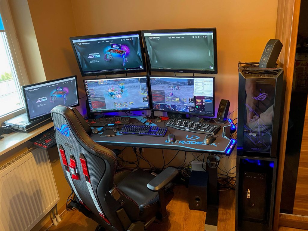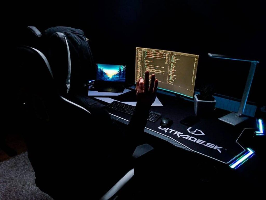 Ultradesk FORCE oferuje największą powierzchnię roboczą spośród wszystkich modeli naszej marki. Blat został pokryty specjalną karbonową powierzchnią ochronną, która zabezpiecza go przed uszkodzeniami, trwałymi przebarwieniami i wilgocią. Rama wykonana jest z grubej stali i jest uzupełniona specjalnymi elementami wzmacniającymi. Oferuje wzorowe właściwości statyczne nawet przy obciążeniu konstrukcji dużą ilością sprzętu. Przednia krawędź pulpitu została pochylona na całej długości w celu ułatwienia korzystania z klawiatury i myszy komputerowej. Z tyłu znajduje się długa komora do zarządzania kablami i zasilaniem. Podkładka pod mysz w rozmiarze XXL zawsze dołączona w zestawie.