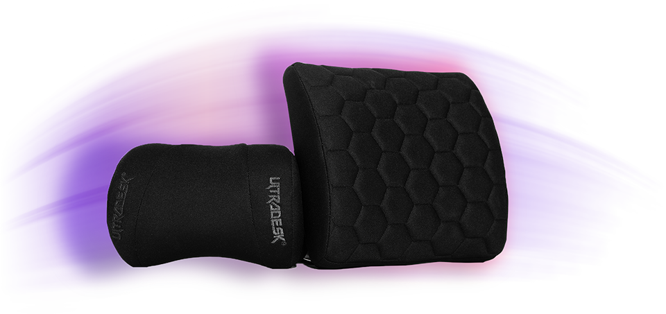 W komplecie dostarczamy dwie poduszki, które jeszcze wyraźniej podnoszą walory ergonomiczne produktu. Zostały one zaprojektowane do wsparcia odcinka szyjnego oraz lędźwiowego waszego kręgosłupa i można je z łatwością zamontować na oparciu fotela. Aby z czasem pod sporym obciążeniem nie utraciły swojej ergonomicznej formy, do ich wypełnienia zastosowano syntetyczną piankę zapamiętującą kształty. Obicie poduszek wyprodukowane jest w kolorze czarnym z tkaniny materiałowej.